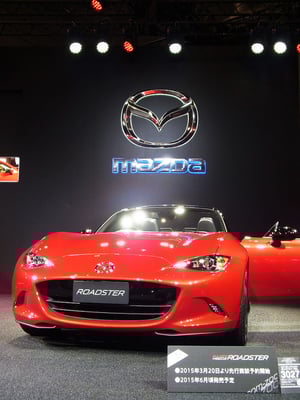 ブース内のステージには、間もなく発売開始のCX-3と、2015年6月ごろ発売予定の新型ロードスターの姿が!